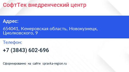 СофтТек, внедренческий центр по адресу 654041, Кемеровская область, Новокузнецк, Циолковского, 9 в дальнейшем Организация, размещена в следующих категориях: