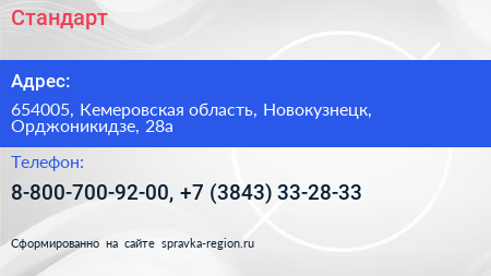 Стандарт по адресу 654005, Кемеровская область, Новокузнецк, Орджоникидзе, 28а в дальнейшем Организация, размещена в следующих категориях: