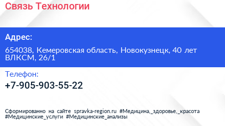 Связь Технологии по адресу 654038, Кемеровская область, Новокузнецк, 40 лет ВЛКСМ, 26/1 в дальнейшем Организация, размещена в следующих категориях: