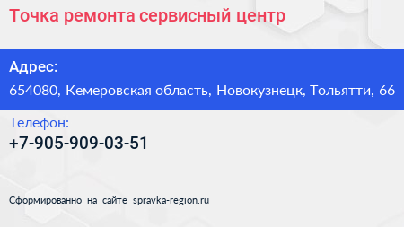 Точка ремонта, сервисный центр по адресу 654080, Кемеровская область, Новокузнецк, Тольятти, 66 в дальнейшем Организация, размещена в следующих категориях: