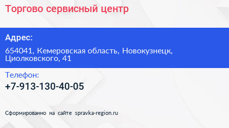 Торгово-сервисный центр по адресу 654041, Кемеровская область, Новокузнецк, Циолковского, 41 в дальнейшем Организация, размещена в следующих категориях: