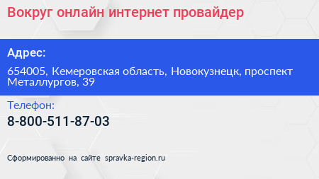 Вокруг онлайн, интернет-провайдер по адресу 654005, Кемеровская область, Новокузнецк, проспект Металлургов, 39 в дальнейшем Организация, размещена в следующих категориях: