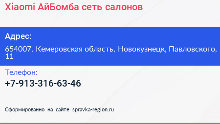 Xiaomi & АйБомба, сеть салонов по адресу 654007, Кемеровская область, Новокузнецк, Павловского, 11 в дальнейшем Организация, размещена в следующих категориях: