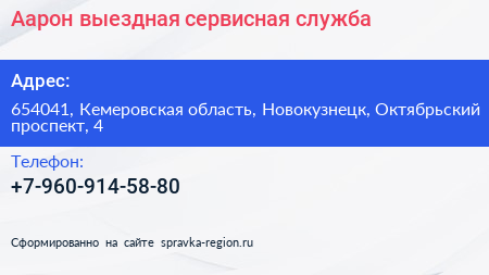 Аарон, выездная сервисная служба по адресу 654041, Кемеровская область, Новокузнецк, Октябрьский проспект, 4 в дальнейшем Организация, размещена в следующих категориях: