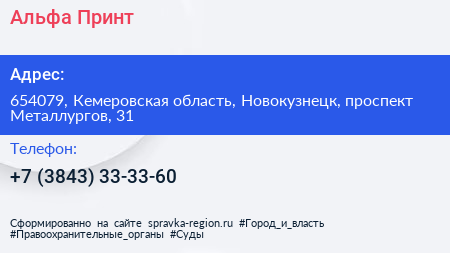 Альфа-Принт по адресу 654079, Кемеровская область, Новокузнецк, проспект Металлургов, 31 в дальнейшем Организация, размещена в следующих категориях: