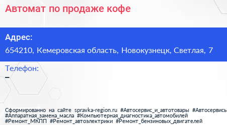 Автомат по продаже кофе по адресу 654210, Кемеровская область, Новокузнецк, Светлая, 7 в дальнейшем Организация, размещена в следующих категориях: