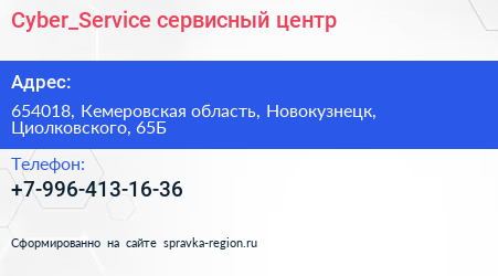 Cyber_Service, сервисный центр по адресу 654018, Кемеровская область, Новокузнецк, Циолковского, 65Б в дальнейшем Организация, размещена в следующих категориях: