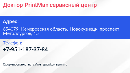 Доктор PrintMan, сервисный центр по адресу 654079, Кемеровская область, Новокузнецк, проспект Металлургов, 15 в дальнейшем Организация, размещена в следующих категориях: