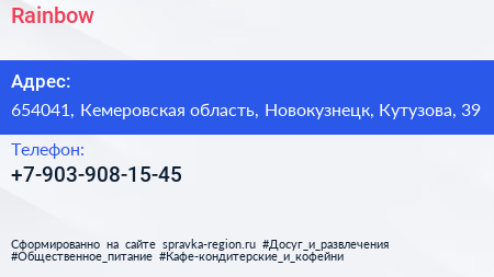 Rainbow по адресу 654041, Кемеровская область, Новокузнецк, Кутузова, 39 в дальнейшем Организация, размещена в следующих категориях:
