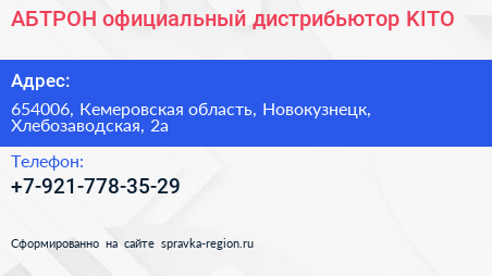 АБТРОН, официальный дистрибьютор KITO по адресу 654006, Кемеровская область, Новокузнецк, Хлебозаводская, 2а в дальнейшем Организация, размещена в следующих категориях: