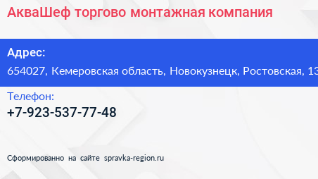 АкваШеф, торгово-монтажная компания по адресу 654027, Кемеровская область, Новокузнецк, Ростовская, 13 в дальнейшем Организация, размещена в следующих категориях: