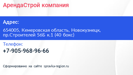 АрендаСтрой, компания по адресу 654005, Кемеровская область, Новокузнецк, пр.Строителей 56Б к.1 (40 бокс) в дальнейшем Организация, размещена в следующих категориях: