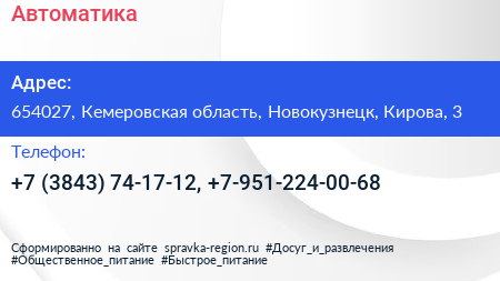 Автоматика по адресу 654027, Кемеровская область, Новокузнецк, Кирова, 3 в дальнейшем Организация, размещена в следующих категориях: