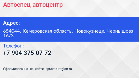 Автоспец, автоцентр по адресу 654044, Кемеровская область, Новокузнецк, Чернышова, 16/3 в дальнейшем Организация, размещена в следующих категориях: