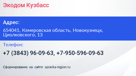 Экодом-Кузбасс по адресу 654041, Кемеровская область, Новокузнецк, Циолковского, 13 в дальнейшем Организация, размещена в следующих категориях:
