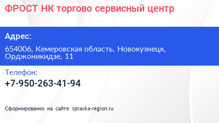 ФРОСТ-НК, торгово-сервисный центр по адресу 654006, Кемеровская область, Новокузнецк, Орджоникидзе, 11 в дальнейшем Организация, размещена в следующих категориях: