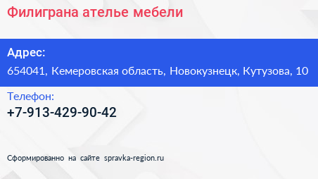 Филиграна, ателье мебели по адресу 654041, Кемеровская область, Новокузнецк, Кутузова, 10 в дальнейшем Организация, размещена в следующих категориях: