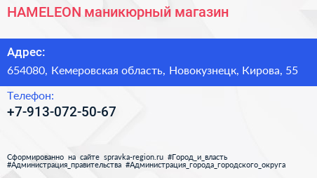 HAMELEON, маникюрный магазин по адресу 654080, Кемеровская область, Новокузнецк, Кирова, 55 в дальнейшем Организация, размещена в следующих категориях: