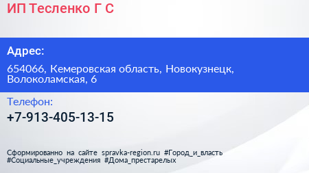ИП Тесленко Г.С. по адресу 654066, Кемеровская область, Новокузнецк, Волоколамская, 6 в дальнейшем Организация, размещена в следующих категориях: