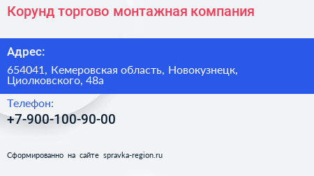 Корунд, торгово-монтажная компания по адресу 654041, Кемеровская область, Новокузнецк, Циолковского, 48а в дальнейшем Организация, размещена в следующих категориях: