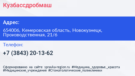 Кузбассдробмаш по адресу 654006, Кемеровская область, Новокузнецк, Производственная, 21/6 в дальнейшем Организация, размещена в следующих категориях: