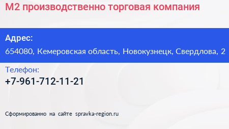 М2, производственно-торговая компания по адресу 654080, Кемеровская область, Новокузнецк, Свердлова, 2 в дальнейшем Организация, размещена в следующих категориях: