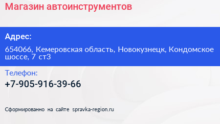 Магазин автоинструментов по адресу 654066, Кемеровская область, Новокузнецк, Кондомское шоссе, 7 ст3 в дальнейшем Организация, размещена в следующих категориях: