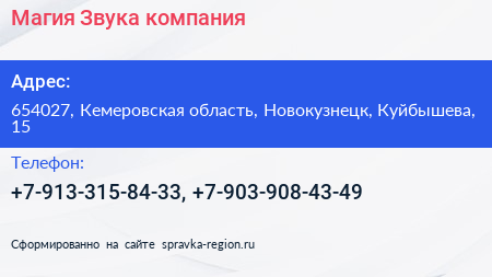 Магия Звука, компания по адресу 654027, Кемеровская область, Новокузнецк, Куйбышева, 15 в дальнейшем Организация, размещена в следующих категориях: