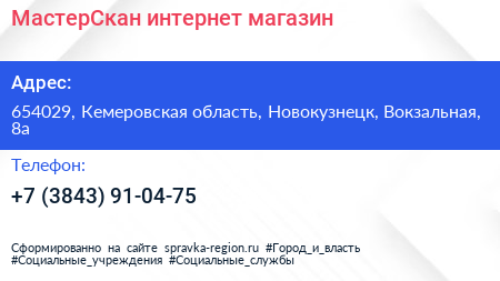МастерСкан, интернет-магазин по адресу 654029, Кемеровская область, Новокузнецк, Вокзальная, 8а в дальнейшем Организация, размещена в следующих категориях: