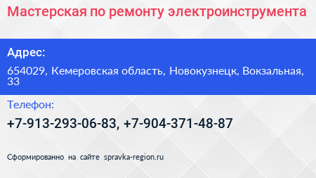Мастерская по ремонту электроинструмента по адресу 654029, Кемеровская область, Новокузнецк, Вокзальная, 33 в дальнейшем Организация, размещена в следующих категориях: