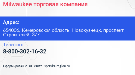 Milwaukee, торговая компания по адресу 654006, Кемеровская область, Новокузнецк, проспект Строителей, 3/7 в дальнейшем Организация, размещена в следующих категориях: