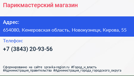 Парикмастерский магазин по адресу 654080, Кемеровская область, Новокузнецк, Кирова, 55 в дальнейшем Организация, размещена в следующих категориях: