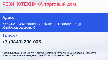РЕЗИНОТЕХНИКА, торговый дом по адресу 654006, Кемеровская область, Новокузнецк, Хлебозаводская, 6 в дальнейшем Организация, размещена в следующих категориях: