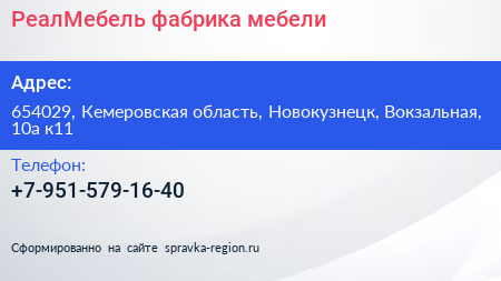 РеалМебель, фабрика мебели по адресу 654029, Кемеровская область, Новокузнецк, Вокзальная, 10а к11 в дальнейшем Организация, размещена в следующих категориях: