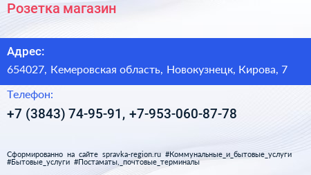 Розетка, магазин по адресу 654027, Кемеровская область, Новокузнецк, Кирова, 7 в дальнейшем Организация, размещена в следующих категориях: