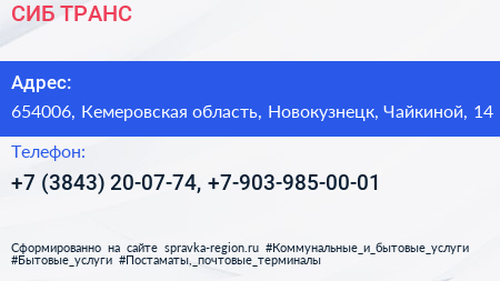 СИБ-ТРАНС по адресу 654006, Кемеровская область, Новокузнецк, Чайкиной, 14 в дальнейшем Организация, размещена в следующих категориях:
