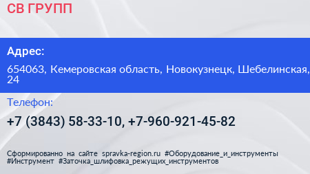 СВ-ГРУПП по адресу 654063, Кемеровская область, Новокузнецк, Шебелинская, 24 в дальнейшем Организация, размещена в следующих категориях: