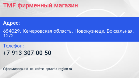 TMF, фирменный магазин по адресу 654029, Кемеровская область, Новокузнецк, Вокзальная, 12/2 в дальнейшем Организация, размещена в следующих категориях: