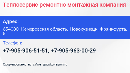 Теплосервис, ремонтно-монтажная компания по адресу 654080, Кемеровская область, Новокузнецк, Франкфурта, 8 в дальнейшем Организация, размещена в следующих категориях: