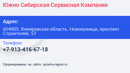 Южно-Сибирская Сервисная Компания по адресу 654005, Кемеровская область, Новокузнецк, проспект Строителей, 57 в дальнейшем Организация, размещена в следующих категориях: