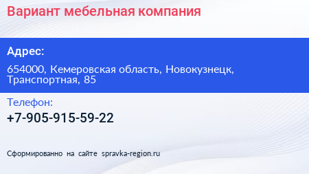 Вариант, мебельная компания по адресу 654000, Кемеровская область, Новокузнецк, Транспортная, 85 в дальнейшем Организация, размещена в следующих категориях: