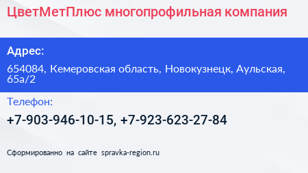 ЦветМетПлюс, многопрофильная компания по адресу 654084, Кемеровская область, Новокузнецк, Аульская, 65а/2 в дальнейшем Организация, размещена в следующих категориях:
