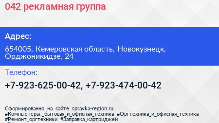042, рекламная группа по адресу 654005, Кемеровская область, Новокузнецк, Орджоникидзе, 24 в дальнейшем Организация, размещена в следующих категориях: