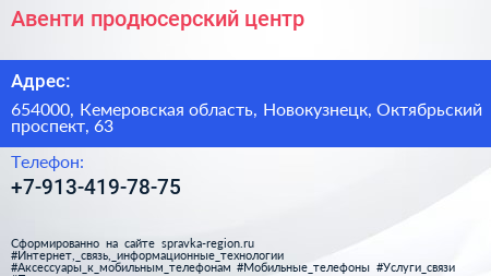 Авенти, продюсерский центр по адресу 654000, Кемеровская область, Новокузнецк, Октябрьский проспект, 63 в дальнейшем Организация, размещена в следующих категориях: