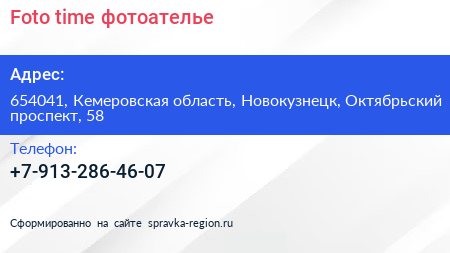 Foto-time, фотоателье по адресу 654041, Кемеровская область, Новокузнецк, Октябрьский проспект, 58 в дальнейшем Организация, размещена в следующих категориях: