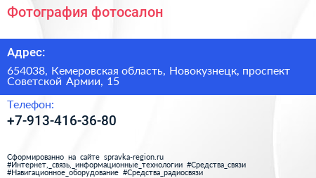 Фотография, фотосалон по адресу 654038, Кемеровская область, Новокузнецк, проспект Советской Армии, 15 в дальнейшем Организация, размещена в следующих категориях: