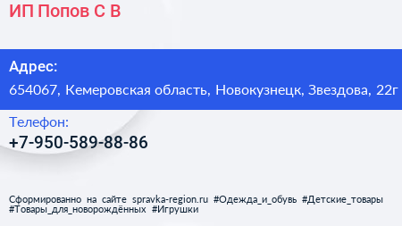 ИП Попов С.В. по адресу 654067, Кемеровская область, Новокузнецк, Звездова, 22г в дальнейшем Организация, размещена в следующих категориях: