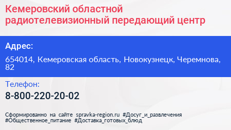 Кемеровский областной радиотелевизионный передающий центр по адресу 654014, Кемеровская область, Новокузнецк, Черемнова, 82 в дальнейшем Организация, размещена в следующих категориях:
