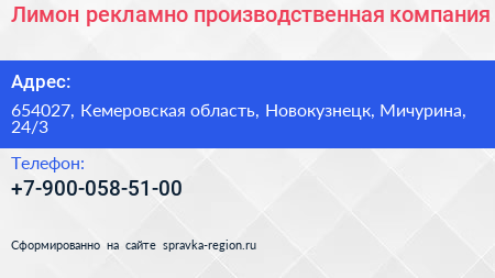 Лимон, рекламно-производственная компания по адресу 654027, Кемеровская область, Новокузнецк, Мичурина, 24/3 в дальнейшем Организация, размещена в следующих категориях: