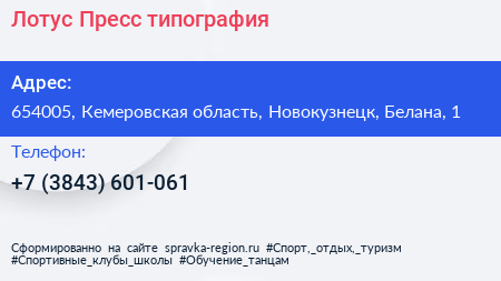 Лотус-Пресс, типография по адресу 654005, Кемеровская область, Новокузнецк, Белана, 1 в дальнейшем Организация, размещена в следующих категориях: